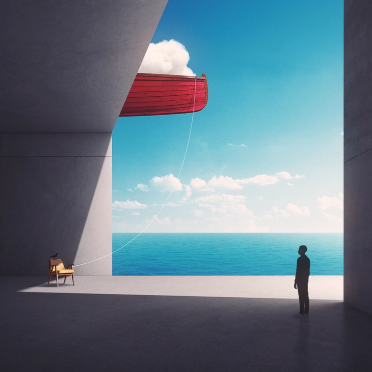 The feeling that you could have lived more and better will always float over you, like the boat tethered to a chair with a white thread. It's the sense of missed opportunities mirrored in the stillness of the observing man. Perhaps it's the weight of unrealized dreams or decisions unmade that keeps him immobile. The boat, symbolizing adventure, hangs trapped between sky and earth, like the yearnings in the man's mind.