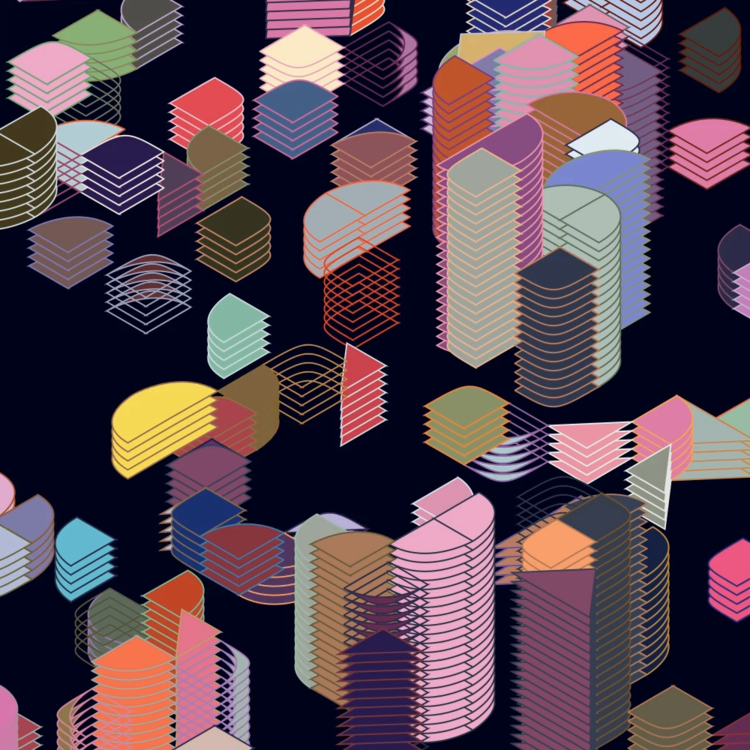 Block Cityscape is a generative artwork that reimagines an ever-evolving urban landscape through stacked geometric forms. Each structure is duplicated and shaped based on Perlin noise values assigned to its location, resulting in a rhythmic arrangement that echoes patterns of urban development. The blocks subtly shift over time—morphing from sharp-edged rectangles to rounded forms—suggesting the passage of time and the organic nature of city growth. Though seemingly static, the composition continuously transforms, revealing the dynamic rhythm of a city that is always under construction.