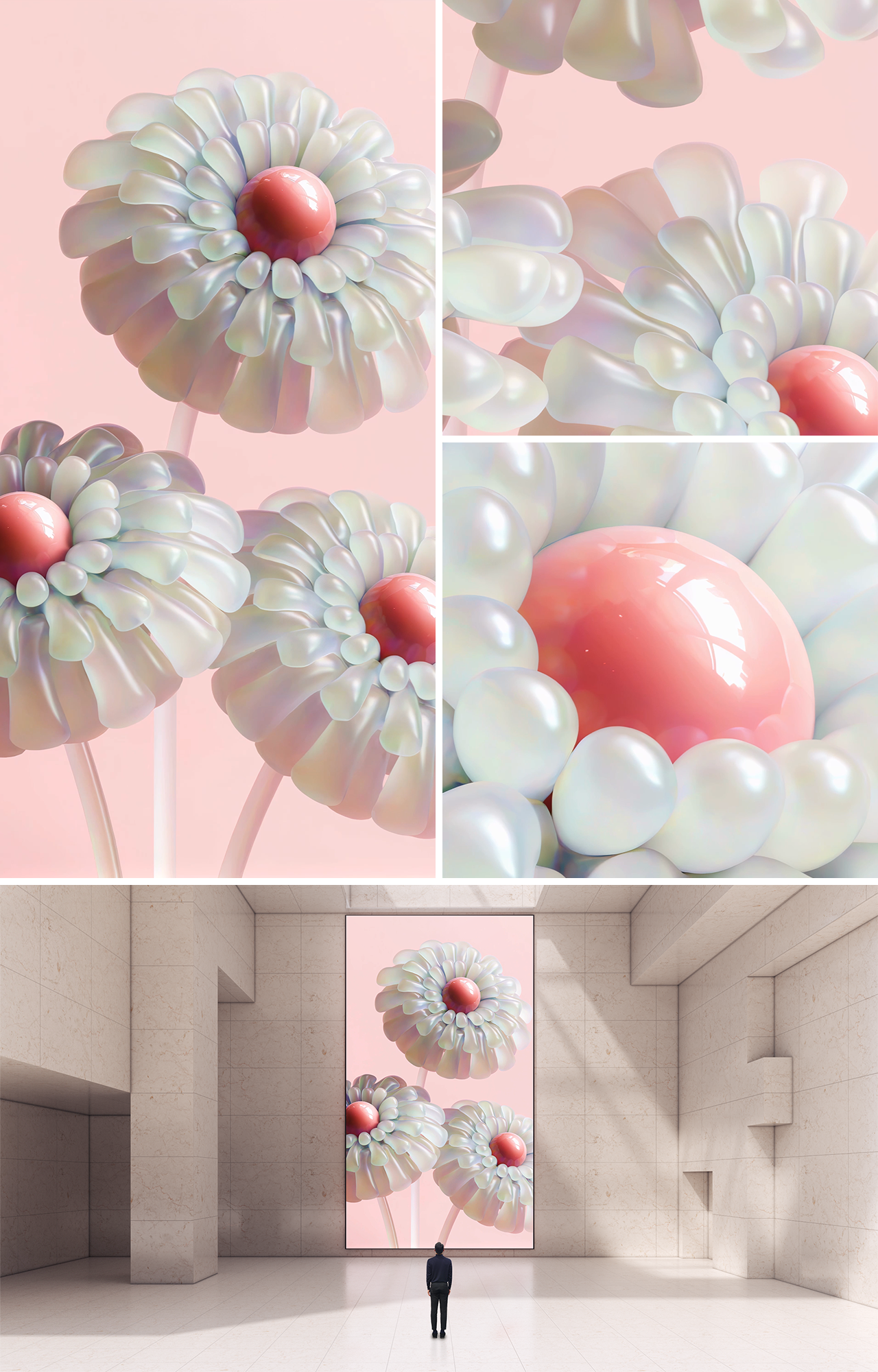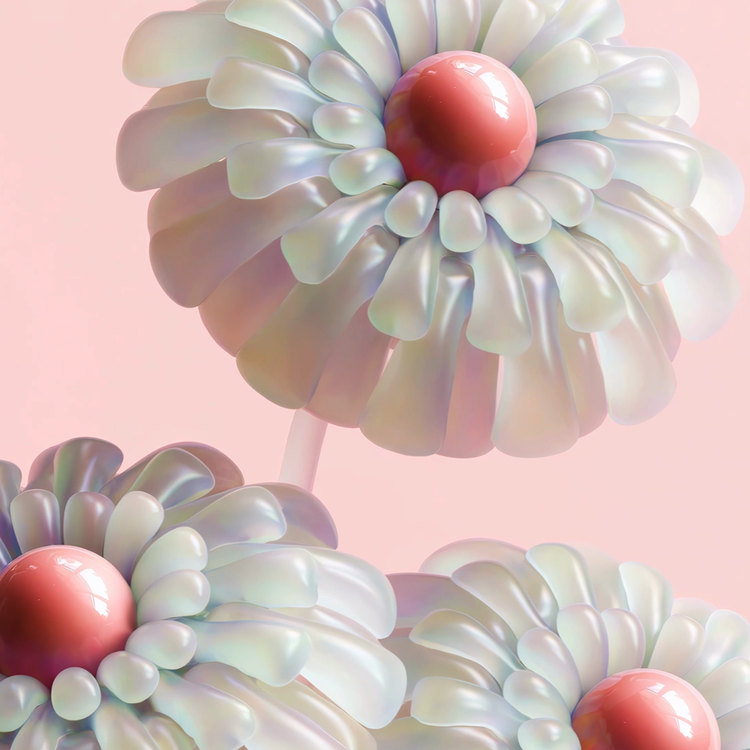 Pearlescent blooms, glowing with the soft, opalescent sheen of moonlit pearls, unfurl their delicate petals in a graceful symphony. Swayed by ethereal currents, these floral forms ripple and dance, each movement a fluid, deliberate step in an intimate ballet. Their gestures weave a silent performance, guided by an unspoken melody. The interplay of light, color, and motion reveals fleeting glimpses of transcendent beauty, whispering of a dreamlike realm. This artwork invites viewers to pause and immerse themselves in the quiet elegance of its flowing choreography.