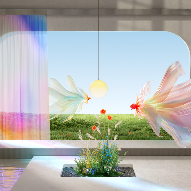"Lucky Spectrum" is a metaphorical expression of the beauty created by the varying wavelengths of light—each refracted and reflected uniquely within the spectrum. This artwork captures the fleeting, almost magical moment when light enters a space like an unexpected gift of fortune. At the heart of the piece are ethereal, floating floral forms that drift through the air like living entities. These dreamlike elements subtly awaken a sense of wonder and resonance in the viewer."Lucky Spectrum" is not merely a display of colors—it is a poetic narrative of light, rhythm, and emotion. The work invites us to immerse ourselves in a serene fusion of nature, architecture, and light, evoking the quiet miracle of a moment when the ordinary is transformed by the extraordinary.