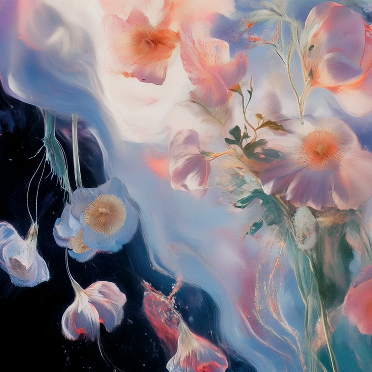 Cloud Flower floats in a realm where petals dissolve into atmosphere. Soft hues and sweeping textures mirror the transient nature of thought and feeling—always forming, always fading. It evokes a dreamlike space between blooming and vanishing, inviting the viewer to pause inside beauty’s impermanence. In this quiet swirl of color and memory, the piece offers a tender reflection on change, softness, and presence.
