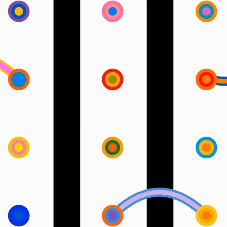 Threading Dots is composed of vertical white columns set against a black background, forming a rhythmic structure across the canvas. Along these columns, vibrant concentric circles are evenly distributed, like markers on a silent grid. While most remain static, some dots reach across the space to connect with others, tracing colorful curved paths that suggest motion and interaction. These arcs form unexpected connections—each dot seemingly searching for a match at random—adding playful unpredictability to the orderly layout. The result is a dynamic interplay between structure and spontaneity, precision and chance.