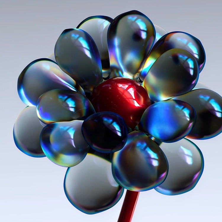 An ephemeral dance softly unveils the delicate splendor of abstract flowers in bloom. As these ethereal forms unfurl, vibrant bursts of color radiate from within, infusing the composition with luminous energy. The hues weave and shift, transforming into a graceful pas de deux of light and form, where shimmering beams and fluid shapes intertwine like dancers in a celestial ballet. Each motion pulses with fleeting beauty, revealing intricate colors that dissolve and reemerge with every glance.