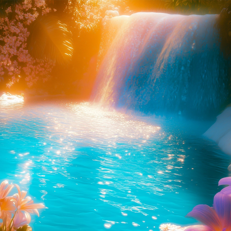 A rainbow-colored waterfall cascades into a forest pond. Golden sunlight and the refreshing hues of water come together to create an enchanting scene reminiscent of the Garden of Eden. As if drawn from a mythical tale, this radiant and dreamlike piece reinterprets the wonder of nature through a new visual language.