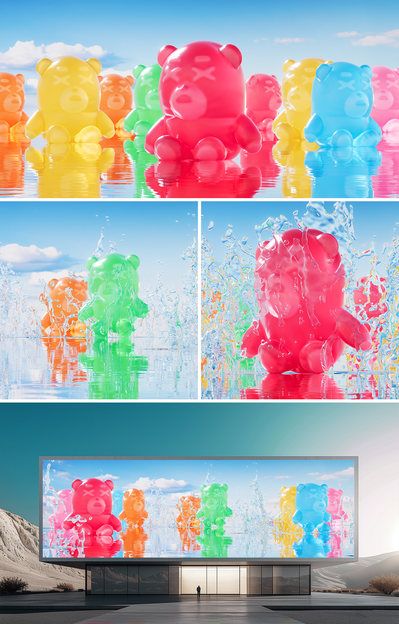 On a peaceful, tranquil horizon, something unexpected unfolds. Giant jelly bears burst onto the scene like an explosion, injecting vibrant energy into the calm and asserting their overwhelming presence. The appearance of gummy bears, which do not fit in with the friendly nature, creates a refreshing atmosphere and attracts attention with its vivid and colorful colors. The combination of familiar spaces and diverse scenes creates a different kind of visual interest.
