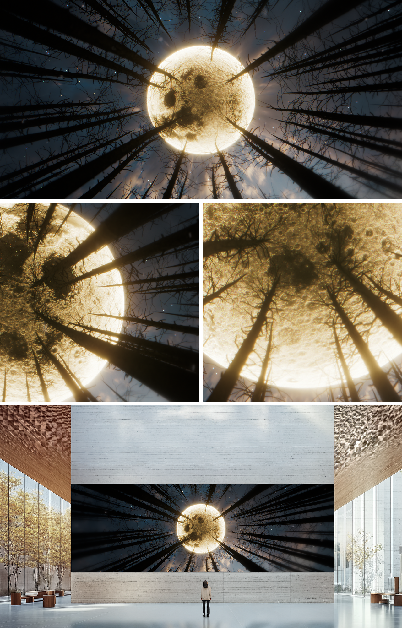 The piece follows a quiet glide through a forest of tall pine trees, their bare branches stretching toward the night sky. Above, the moon hangs large and bright, slowly moving closer as if to meet you, before gently drifting away again. Stars are scattered across the sky, and a faint glow of dawn begins to rise on the horizon. It feels like a brief connection with something bigger, a reminder that beauty often comes close, touches us, then slowly fades.