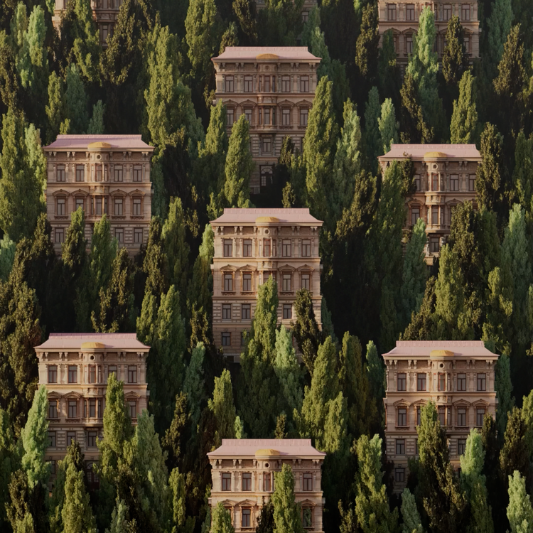 Forest Neighborhood presents a pine forest where classical buildings repeat in a surreal grid. The camera stays still, trees sway gently in the breeze, and distant piano notes drift through the air. It’s a dreamlike scene where architecture and nature exist in quiet harmony, repeating endlessly—as if they belonged to the same whispered memory.