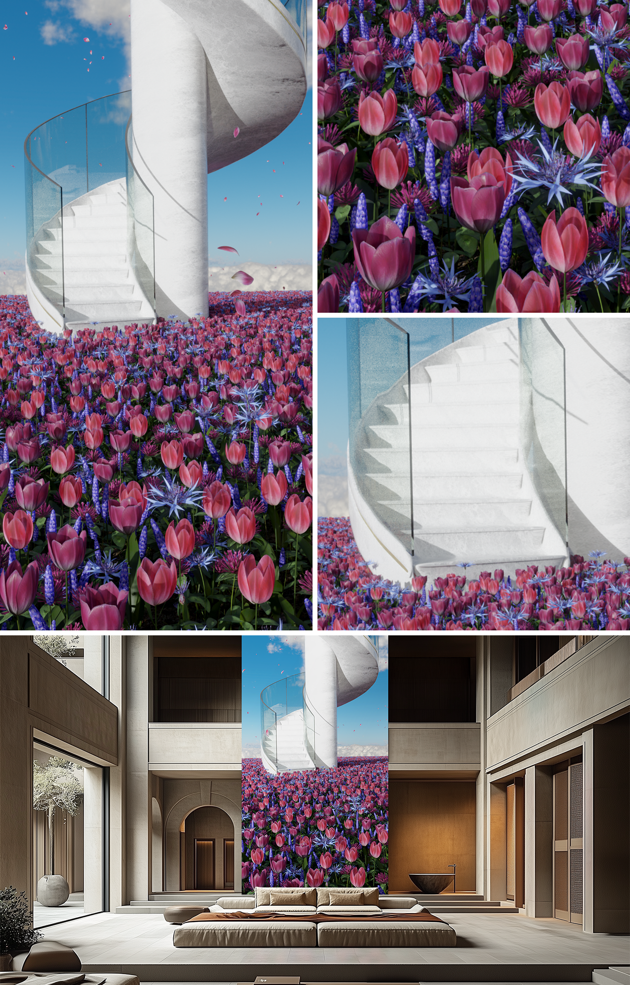 A vast field stretches to the horizon, awash in waves of colorful flowers dancing in the wind. At its center, a white marble staircase extends into the heavens. The field appears to float high above the world, bathed in the brilliant light of a clear blue sky. Petals twirl on the gentle breeze, carried across the flowers in a delicate dance. The surreal scene merges the grounded beauty of nature with an ethereal sense of ascension, inviting the viewer to wander through a landscape that feels both real and fantastical, a place where the imagination can soar freely.