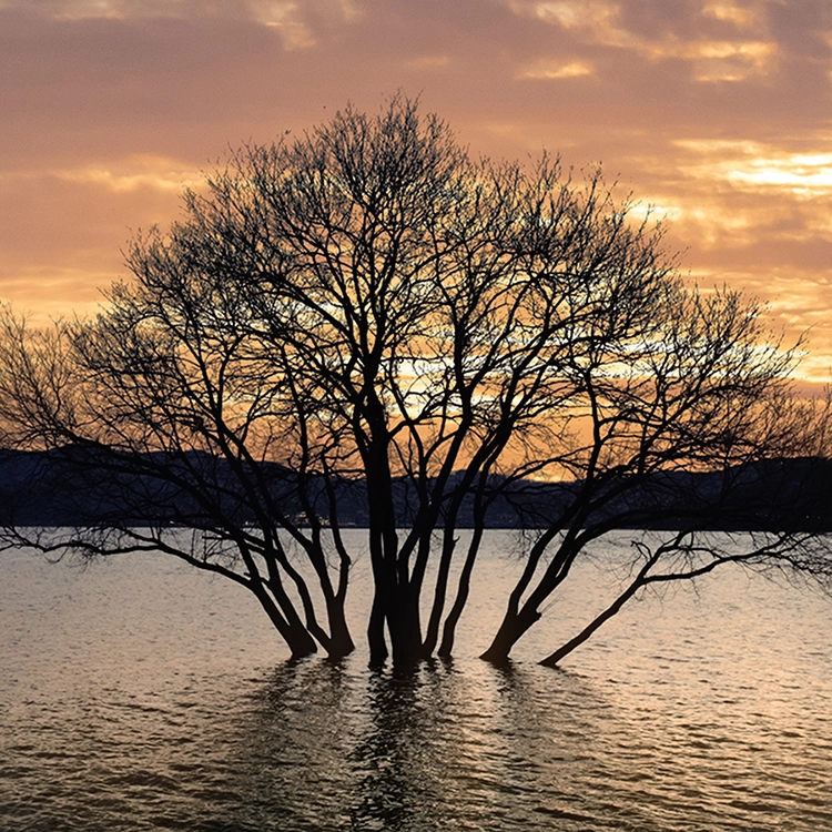 A Golden Tree with golden lights. The sunset changes into a golden hue, lending a beautiful color to the trees lined along the shore of the lake and causing the existence of the Golden Tree to shine even more. Golden light permeates softly across the calm water ripples as the original existence of the golden tree, which connects the golden ripples and the sky, presents beauty and even grandeur.