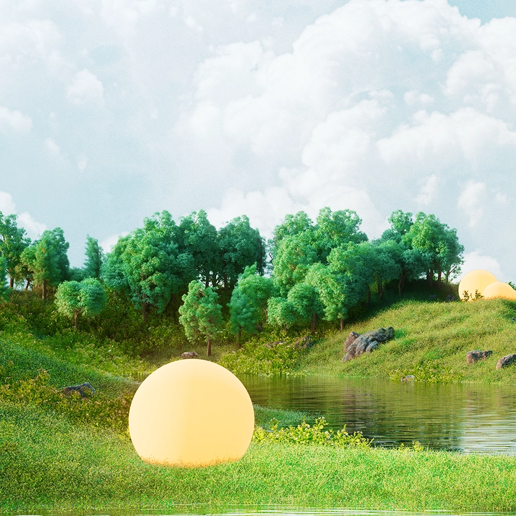 It is a work that interprets a blue meadow floating in the sky in a surreal and tranquil atmosphere. On the lush green field, living spheres gently roll across the hills, creating a peaceful and harmonious scene filled with calm and beauty.