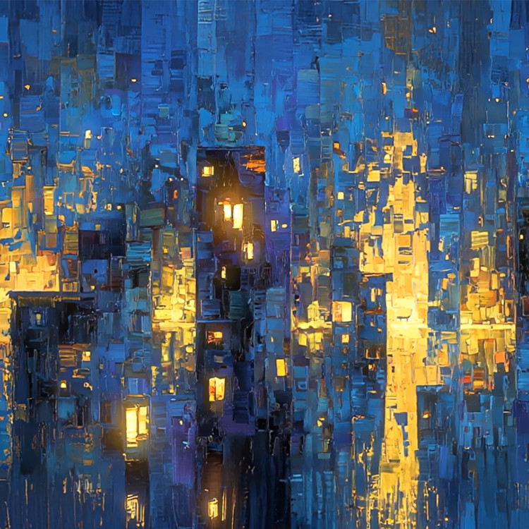 Light flows down across the rain-soaked surface of the city. Buildings and windows lose their form, leaving only blurred outlines that dissolve like ripples within the spreading glow. The city exists as an afterimage of reflected light. In the cold air, the warmth of light seeps through, and within its quiet rhythm, time passes slowly — yet unmistakably.