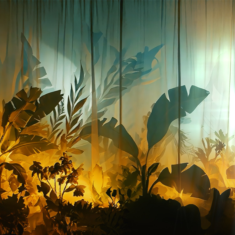 This work unfolds like a shadow play behind a translucent veil. The thin layer functions like a stage curtain, projecting the silhouettes of a wild world unfolding beyond it. The shadows stretch and shrink in turn, adding depth to the space. Through the interplay of light and shadow—through suggestion and empty space— each viewer is invited to complete the forest’s story with their own imagination.