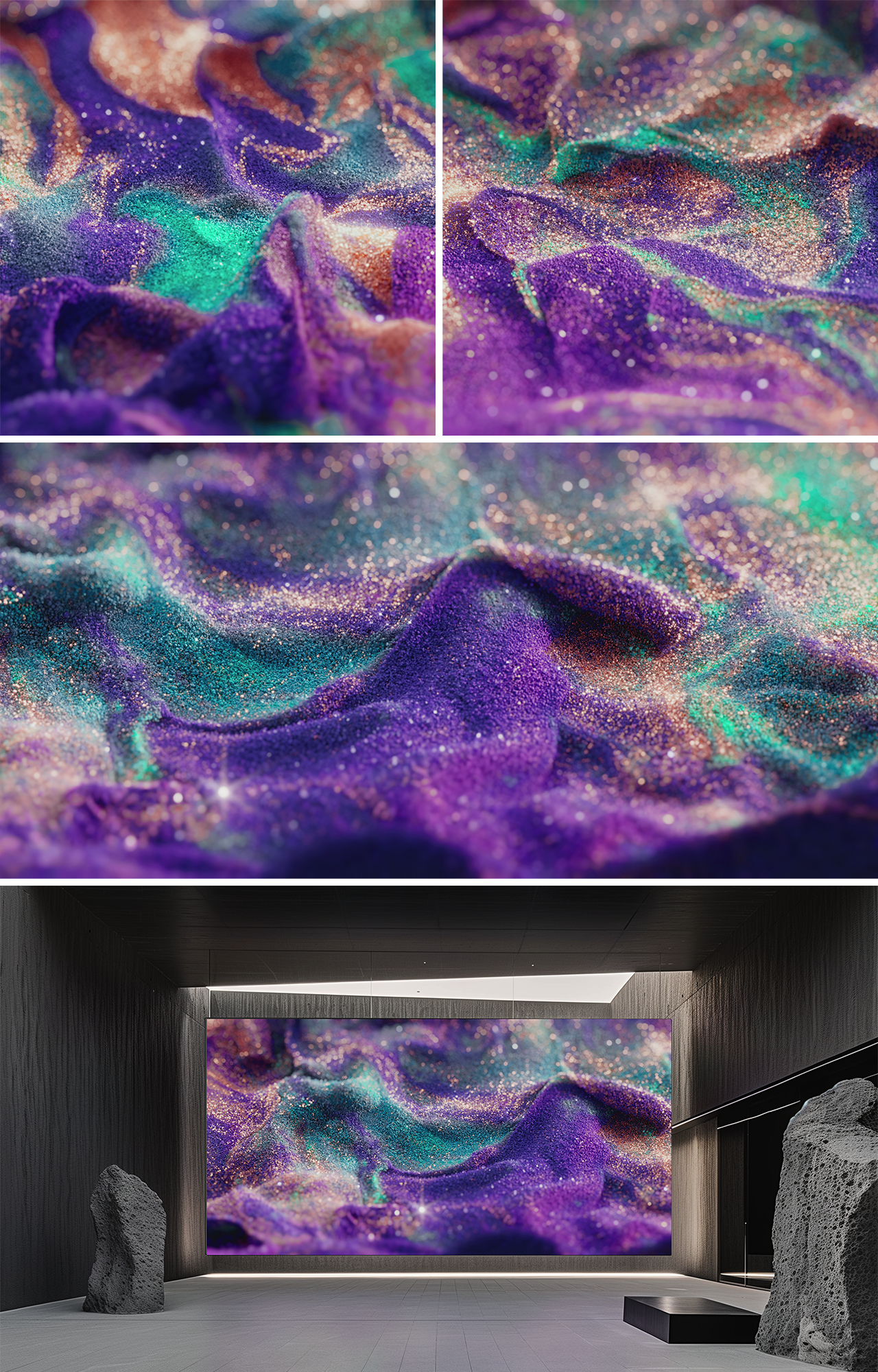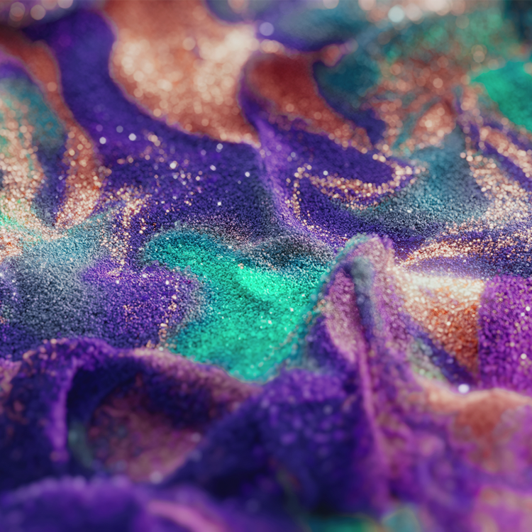 Particles of violet and gold surge like waves across the surface, their textures and hues shifting continuously to form new expressions. Within this fluid landscape, light becomes more than reflection—it is the trace of energy where time and emotion converge. In its quiet motion, the scene reveals that the essence of existencelies not in stillness, but in perpetual flux.