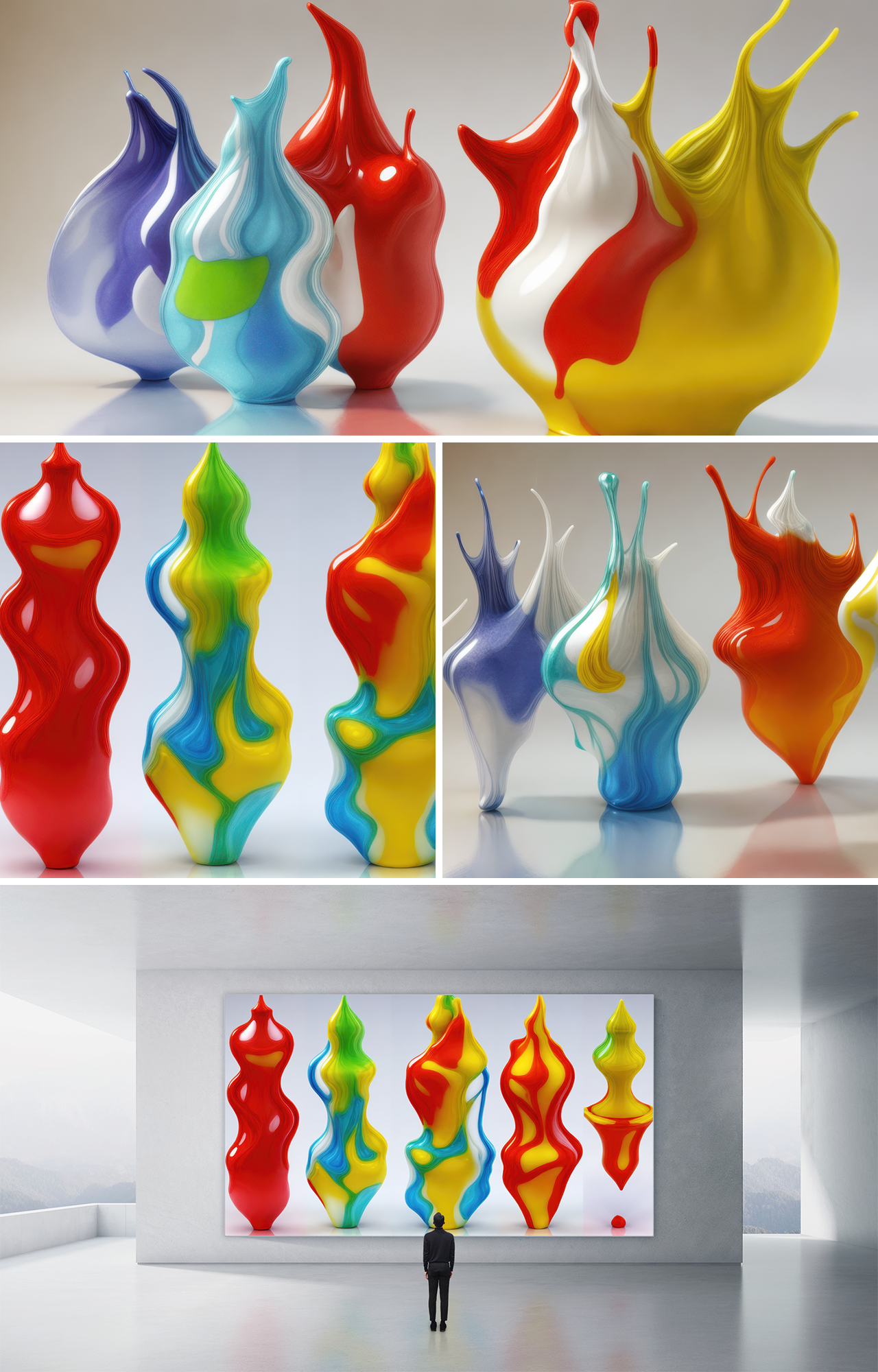 "Fluidium_1 animates a set of vividly colored fluids as if they possessed their own quiet intelligence—cohering, stretching, slipping apart, and reforming in gestures that echo both choreography and natural flow. The environment appears unmistakably physical: a softly illuminated expanse of neutral floor and backdrop, as though this strange performance were taking place on a stage built for something that doesn’t quite exist in the everyday world. That ambiguity becomes part of the work’s allure; it feels real enough to touch, yet ultimately belongs to a space that can only be completed by the viewer’s imagination. The result is an experience that feels both playful and meditative—a moment where liquid becomes a performer, and the viewer is invited to linger in the curiosity of its impossible dance. "