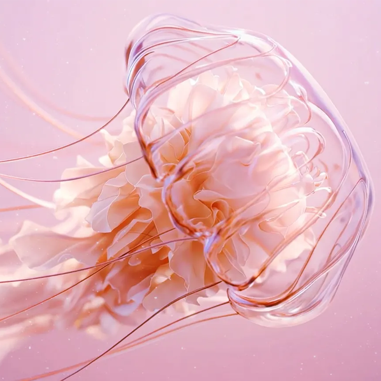 This work captures the precise moment an exquisitely crafted glass objet awakens with life. The transparent body of the jellyfish transforms into a 'living prism,' transmitting and scattering the light of the world. Spreading alongside dreamlike particles, its rhythmic pulsation transcends mere swimming, breathing warmth into the cold, frozen space.