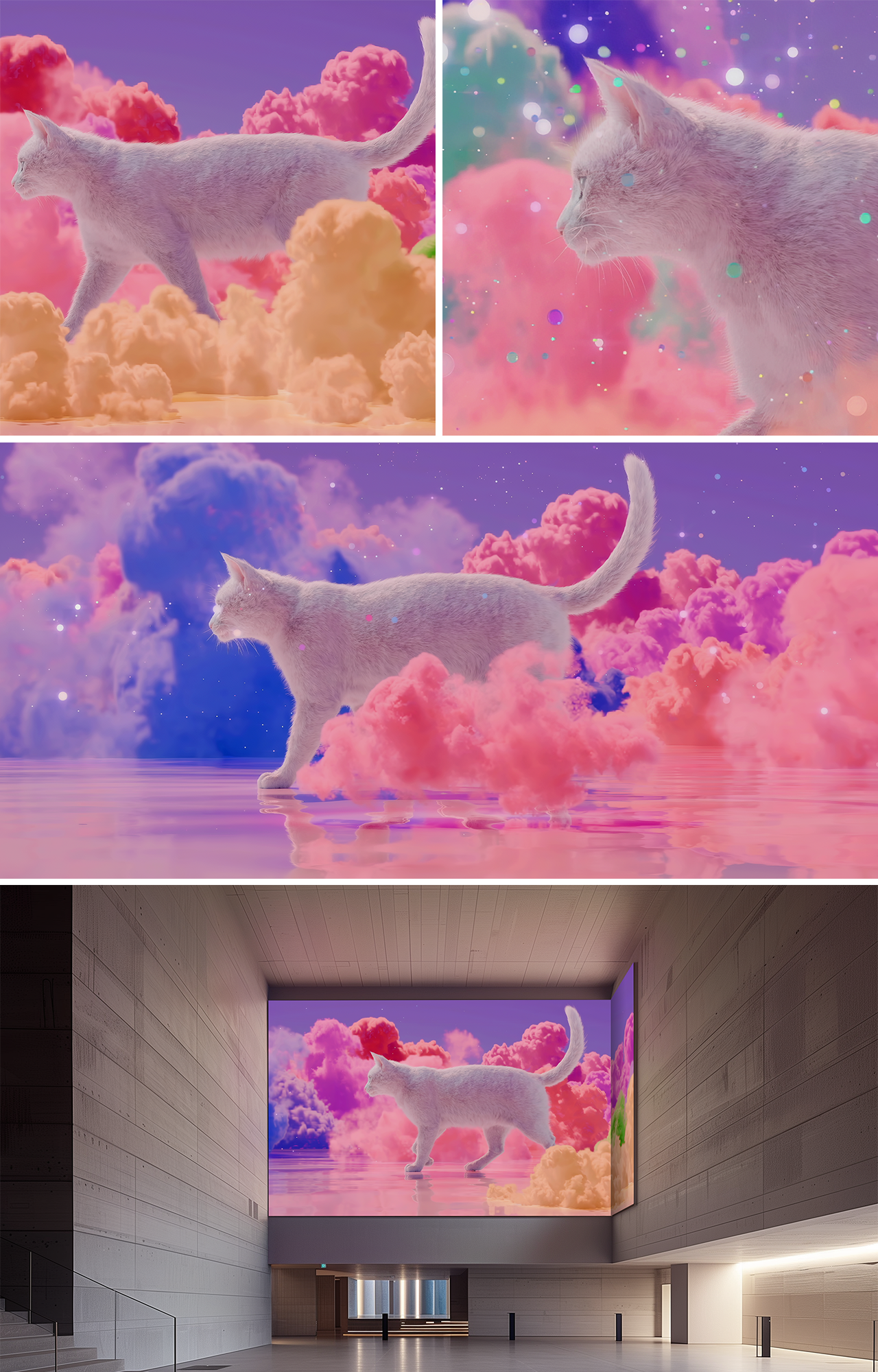 A Moment That Softly Warms the Heart. This work expresses a sense of calm in which heavy earthly thoughts are gently set aside, as one slowly walks above the clouds, following a cat. The cat’s ะฟะปะฐะฒ ะฟะปะฐะฒ — almost floating — movement slows the pace of time, offering a brief release from the gravity of reality. As light and color gradually overlap, the scene unfolds into a sensory walk where rest and comfort quietly linger, inviting viewers to rediscover the light, forgotten breath of everyday life.