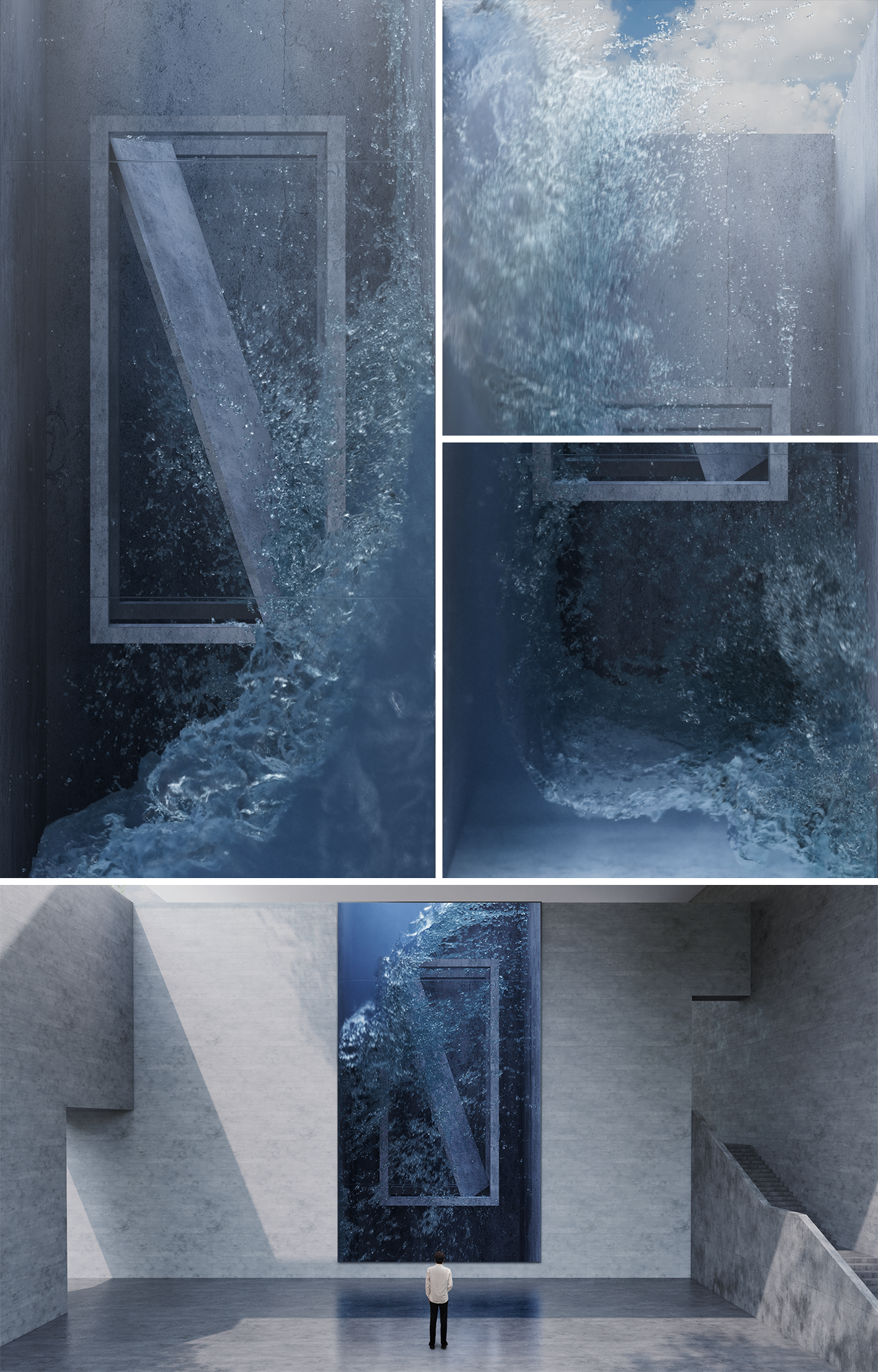 NON_DIRECTIONAL SPACE is a project series that combines surrealism with realistic physics simulations. NON_DIRECTIONAL SPACE_v02 expresses the surreal through sculptures floating in space and the continuously shifting direction of gravity, while using realistic physics simulations to render the fluid dynamics and textures reacting to these gravitational changes. The texture of the sculptures distorted behind the fluid, combined with the controlled movement of light diffusing from the sky, creates an aesthetic that is consistent yet ever-changing. Through this fusion of the surreal and the real, the project invites viewers to experience a realistic surrealism.