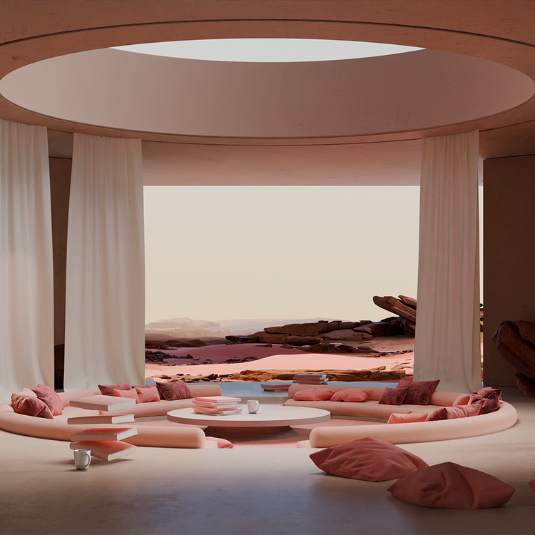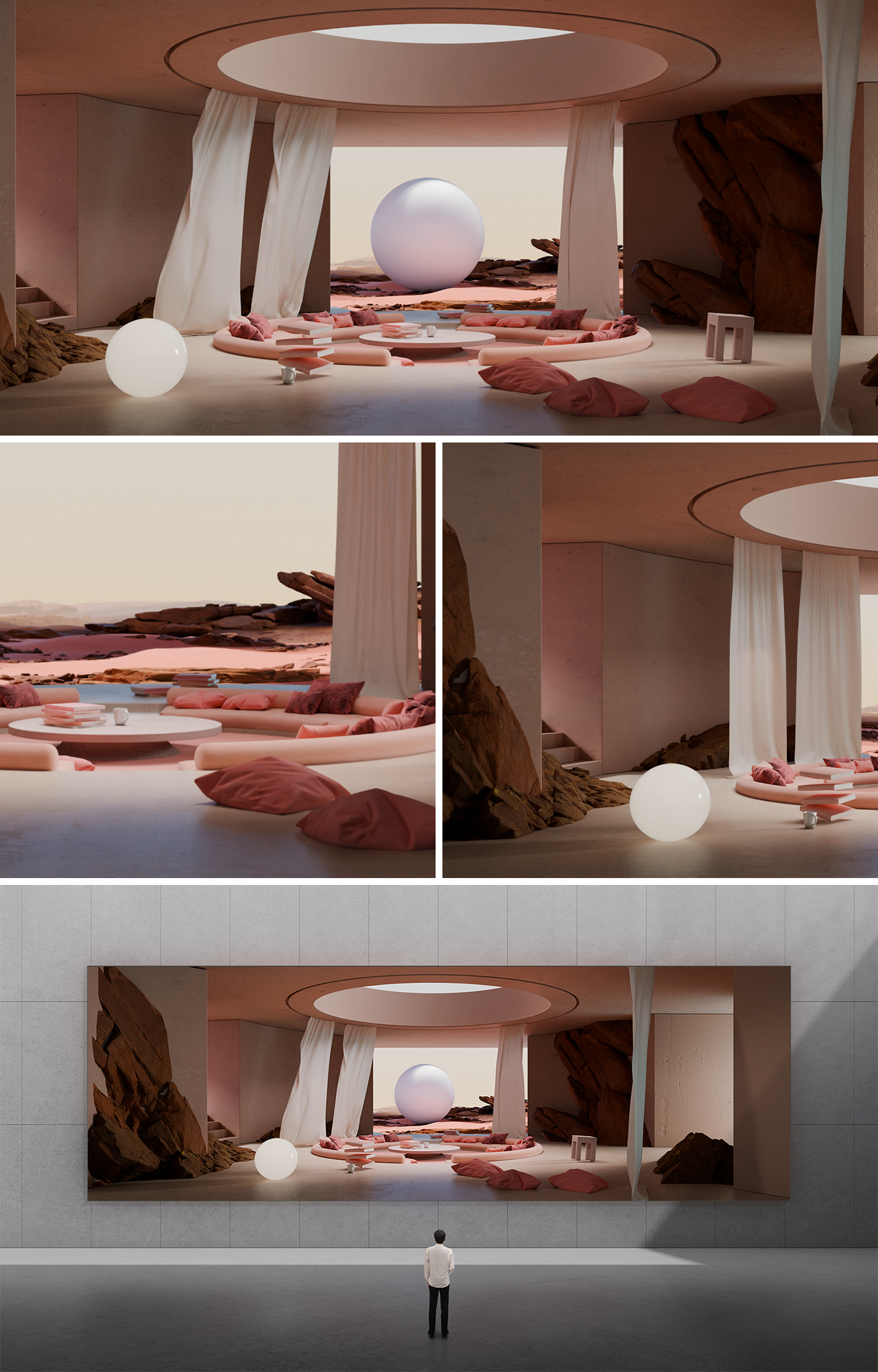 Brutalist Bliss is a digitally created environment designed to offer an escape from reality and a refuge for relaxation and contemplation. Characterized by brutalist open space architecture, this space embodies an aesthetic of minimalism and essentiality. The absence of dividing walls and barriers between interior and exterior creates a sense of continuity and openness, allowing visitors to fully immerse themselves in the surrounding environment. The lack of glass in the windows and doors accentuates this connection, while integrated natural elements enrich the atmosphere with their calm and harmonious presence. The delicate tones of pink and neutral colors contribute to creating an atmosphere of serenity and tranquility, inviting visitors to unwind and be carried away by the peace of the place.