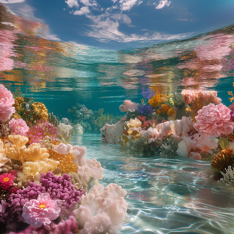 Beneath the surface of crystal-clear water lies a magical underwater garden, filled with stunning corals and dreamy flowers in radiant colors. The ocean floor transforms into a luminous sanctuary where light filters softly through transparent blue, awakening every detail. Corals rise like delicate sculptures, while blossoms unfold in vivid, almost ethereal hues. The clarity of the water enhances the brilliance of each texture and movement, allowing colors to shimmer as though suspended in liquid light. There is no turbulence here — only a gentle rhythm. The scene feels untouched yet alive, as if the sea itself were quietly celebrating its own hidden beauty.