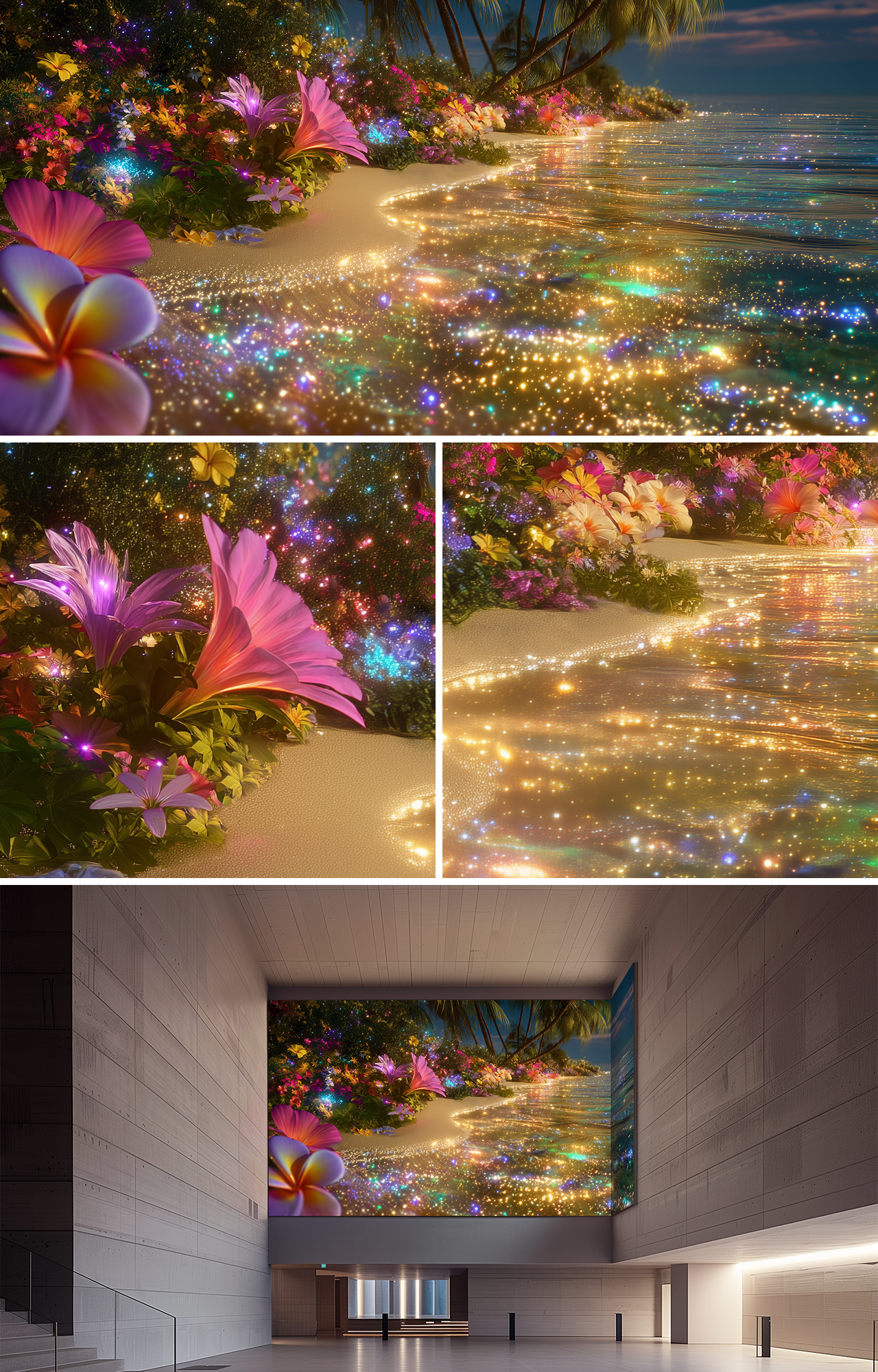 At night, a paradisiacal beach unfolds beneath a tranquil sky, where golden waters shimmer softly along the shoreline. Surrounded by stunning multicolored flowers and gently swaying palm trees, the scene feels suspended between dream and reality. The ocean does not simply reflect light — it radiates it. Waves glisten in liquid gold, creating a luminous path that stretches across the darkened horizon. Along the coast, vibrant blossoms glow subtly in the night air, adding layers of warmth and vitality to the serene landscape. Palm trees frame the scene like silent guardians, their silhouettes contrasting against the soft brilliance of the sea. The atmosphere is calm yet radiant, intimate yet expansive — a place where night carries light instead of shadow.