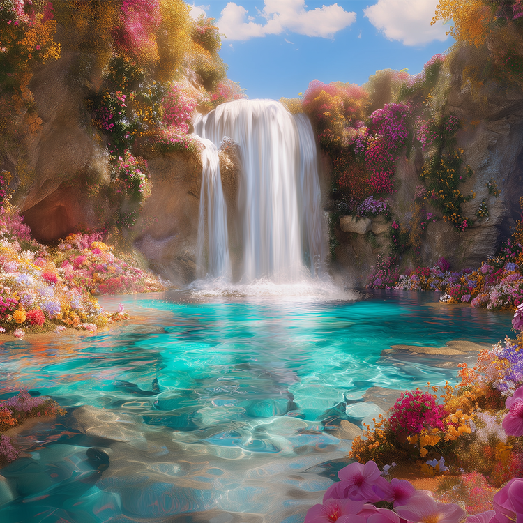 In a magical landscape where a luminous waterfall cascades with crystal-clear water, spring unfolds in full bloom. Surrounded by vibrant, multicolored flowers, the falling stream glows softly as it descends, illuminating the scene with freshness and light. The water flows with remarkable clarity, catching the light in delicate ripples that shimmer like living glass. Around it, blossoms burst open in radiant hues — pinks, yellows, blues, and violets — transforming the surrounding forest into a celebration of renewal. The waterfall becomes more than a natural element; it acts as a source of vitality. Its gentle yet continuous motion suggests awakening, growth, and the quiet optimism that defines spring. Rather than overwhelming the senses, the work offers a serene brightness — an immersive atmosphere where clarity, color, and movement harmonize to evoke a feeling of new beginnings.