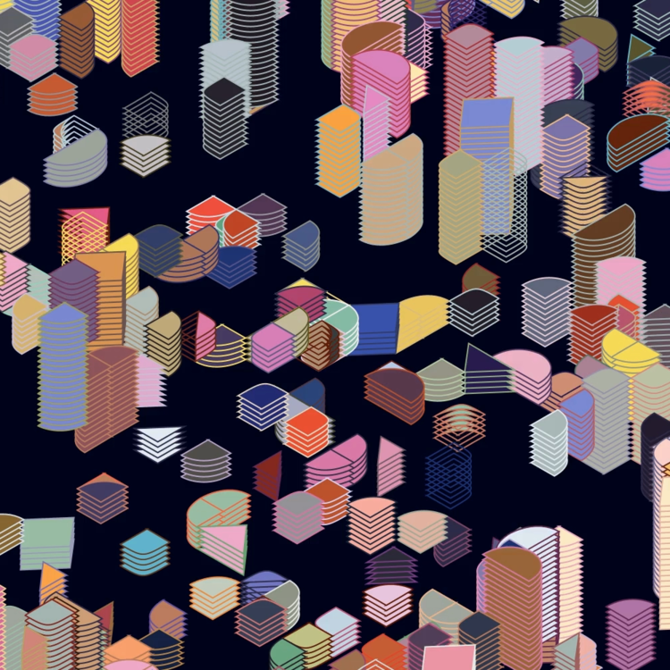 Block Cityscape is a generative artwork that reimagines an ever-evolving urban landscape through stacked geometric forms. Each structure is duplicated and shaped based on Perlin noise values assigned to its location, resulting in a rhythmic arrangement that echoes patterns of urban development. The blocks subtly shift over time—morphing from sharp-edged rectangles to rounded forms—suggesting the passage of time and the organic nature of city growth. Though seemingly static, the composition continuously transforms, revealing the dynamic rhythm of a city that is always under construction.