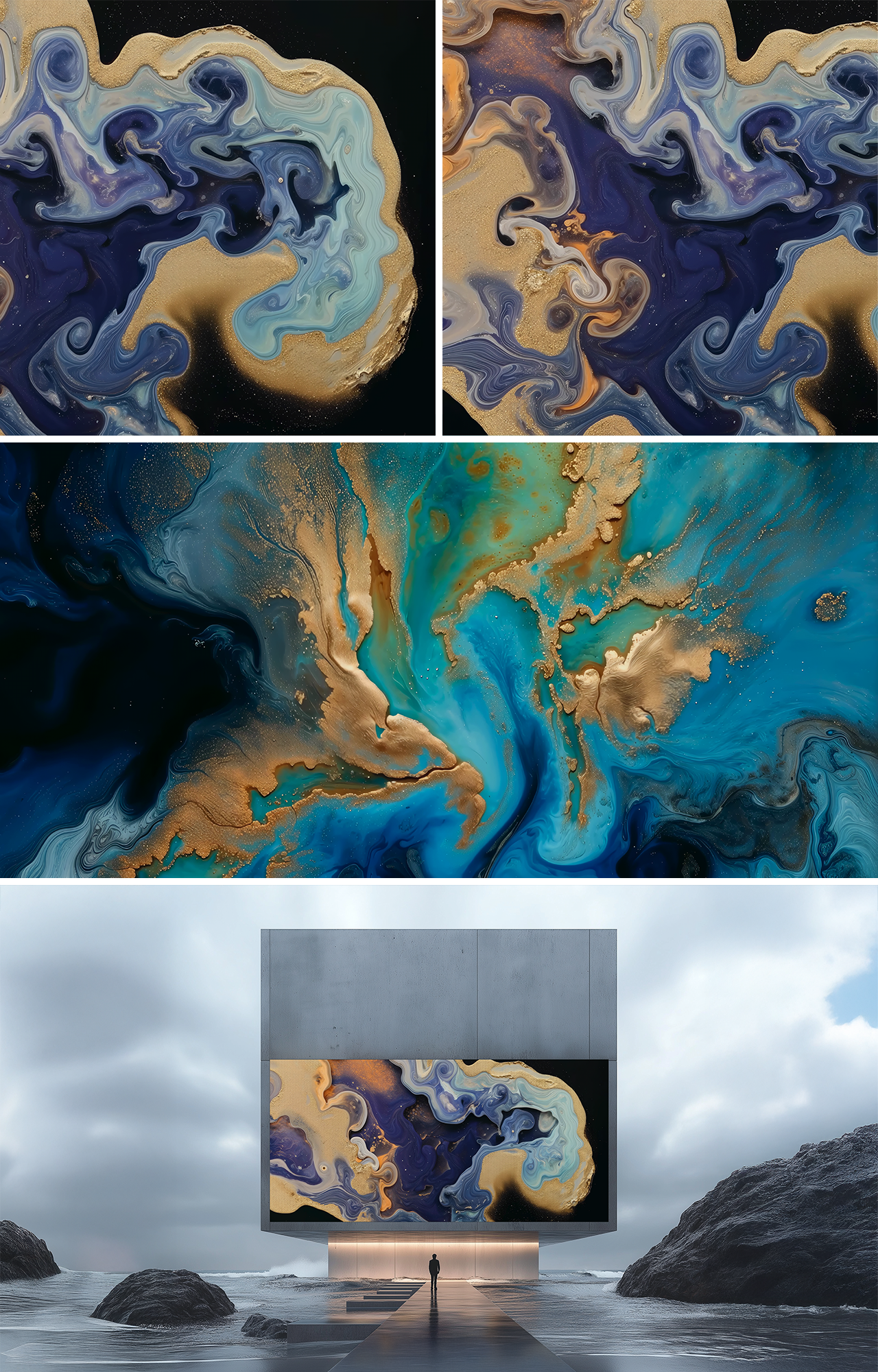 This LED Art exclusive abstract video series transforms organic liquid ink paintings into colorful, fluid motion through photography and generative experimentation. Swirling galaxies of deep purples, rich blues, glowing golds, and many more vibrant hues collide like liquid nebulae, revealing drifting stardust textures. Each piece becomes a living choreography of light and movement, celebrating emotion, depth, and the poetry of fluid transformation.